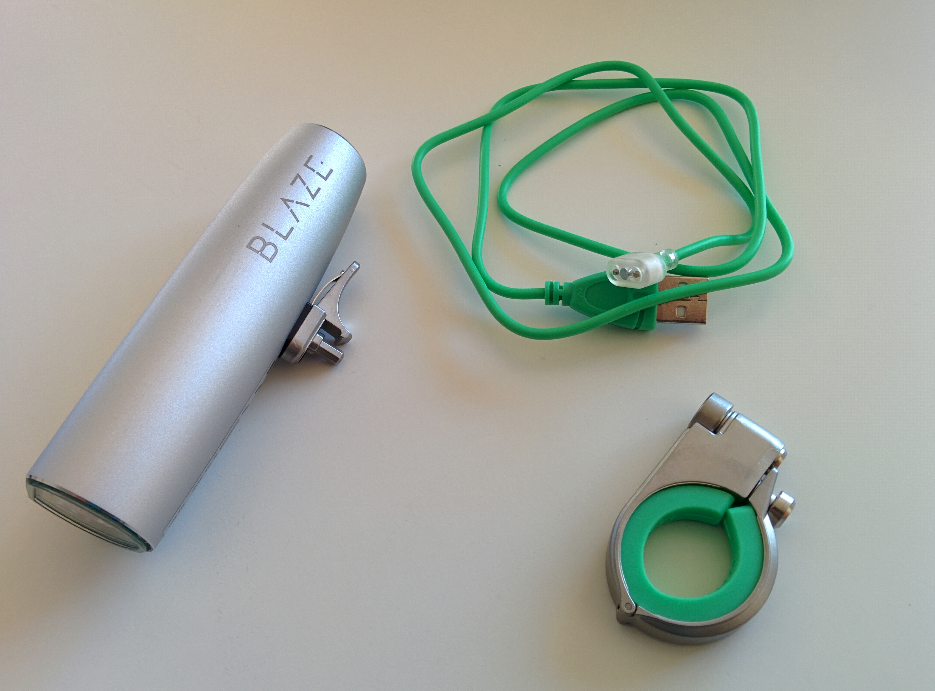 Bei der BLAZE Laserlight handelt es sich um eine sagen wir mal „relativ normale“ LED-Fahrradbeleuchtung mit einer spektakulären Zusatzfunktion, nämlich einem Laser, der einen grünen Radfahrer weit vor sich auf den Asphalt beamt. Das soll Autofahrer, die z.B. von einer Seitenstraße daher kommen, frühzeitig auf den Radfahrer aufmerksam machen.
